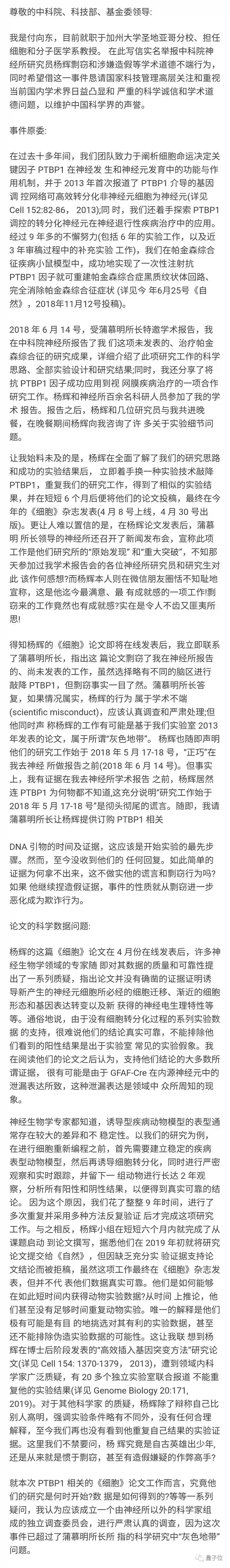 加州大学圣迭戈分校细胞和分子医学系教授付向东,举报中科院神经所研究员杨辉剽窃了自己团队的研究创意。