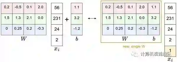 在进一步学习前,要提一下这个经常使用的技巧。它能够将我们常用的参数和合二为一。回忆一下,分类评分函数定义为: