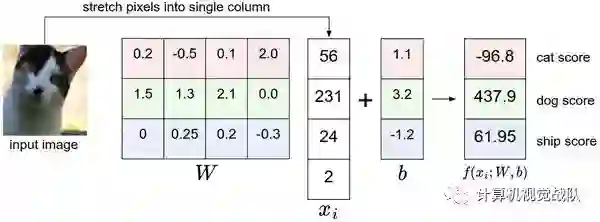 在上面的公式中,假设每个图像数据都被拉长为一个长度为D的列向量,大小为[D x 1]。其中大小为[K x D]的矩阵W和大小为[K x 1]列向量b为该函数的参数。还是以CIFAR-10为例,就包含了第i个图像的所有像素信息,这些信息被拉成为一个[3072 x 1]的列向量,W大小为[10x3072],b的大小为[10x1]。因此,3072个数字(原始像素数值)输入函数,函数输出10个数字(不同分类得到的分值)。参数W被称为权重(weights)。b被称为偏差向量(bias vector),这是因为它影响输出数值,但是并不和原始数据