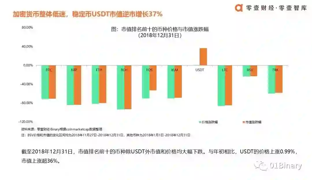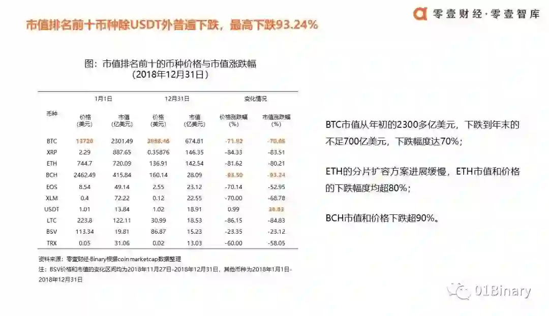 对此,零壹财经·Binary联合数字资产研究院发布的《区块链产业发展报告(2018)》给出了答案。报告从行情、技术、投资和监管等角度全面回顾了区块链2018年的发展状况。报告认为,2018年是区块链的转折之年,行业共识近乎崩塌,而前十大币种中唯有USDT市值上涨更是对整个加密货币行业的讽刺。但隔离见证、闪电网络等区块链技术的持续发展,以及各类大型企业/机构的入场,也让所有人看到了区块链未来发展的希望。