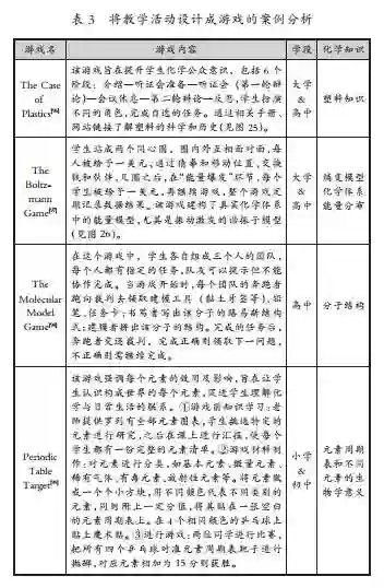 该研究按内容将化学类游戏分为化学介绍类、有机化学类、其他化学游戏。其中化学介绍类可再细分为:基本知识,元素和原子结构,术语、公式、化学方程式书写,化学反应,溶解和溶解性,其他物质。根据游戏元素的使用方式,在教学活动中同样可分为使用游戏、将教学活动设计成游戏两种形式。在游戏中电子游戏、卡片游戏、桌面游戏三者占主导地位。国外与国内的游戏化教学有很多相似之处,但国外的游戏更加多样,且注重引导学生认识微观世界。如,1929年有研究者在课堂上让学生用带钩的原子建构分子模型,直观认识物质的元素构成;1976年有研究者设置了一个游戏,让学生挑选聚苯乙烯小企球做的原子,通过给定的原子大小和价电子数来界定原子,在给定时间内瓶装尽可能多的分子。