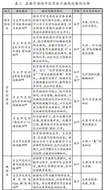 电子游戏(Digital Game)是指依托电子设备进行的一种游戏体验方式,包括游戏机游戏、电脑游戏、移动游戏(主要为手机游戏)等,是很多青少年学生重要的娱乐方式之一。电子游戏具有竞争性、互动性、即时性等特点,对学生会产生强烈的吸引力。此外,相较于非电子类游戏,电子游戏更加形象生动,有利于学生在游戏中产生沉浸感,学生置身其中学习化学知识,易于突破化学难点。随着网络、手持智能终端等的发展普及,教师逐渐在教学活动中尝试使用电子游戏,如表2所示。