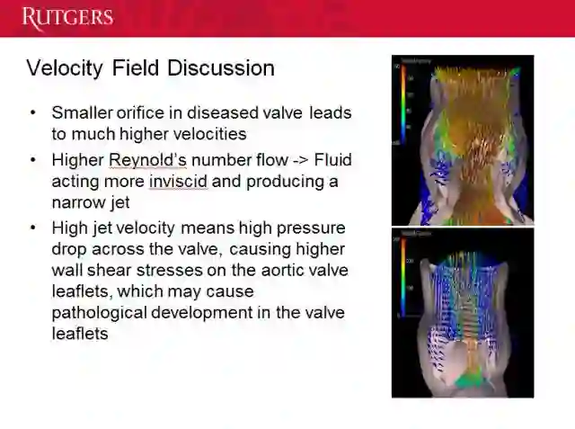 这里是一些关于流速场的讨论。患病瓣膜会有更小的孔洞,会导致更高的流速,产生的高压力可能导致患病。
