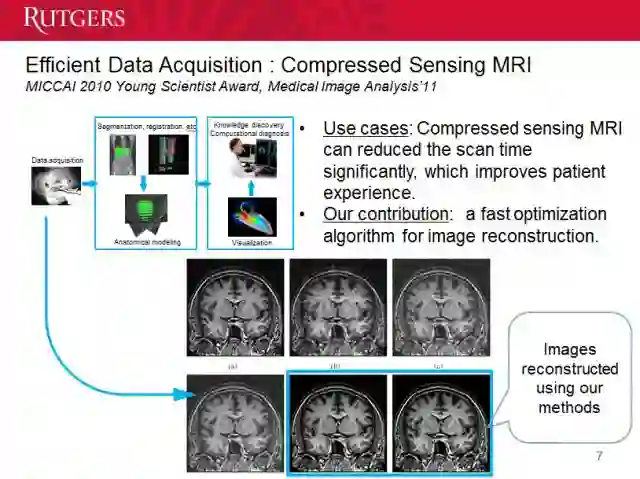 在数据获取方面,压缩传感核磁共振(Compressed Sensing MRI)是一种高效的数据采集方法,能有效降低扫描时间,极大提升病人的体验。我们可以在里面做分割、注册和重建等。