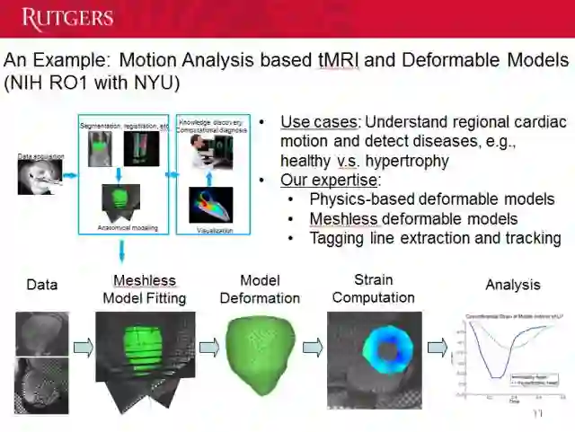 Dimitris Metaxas 教授一直致力于形式化方法的开发,以促进医学图像分析、计算机视觉、计算机图形学以及对多模态语言的理解。在计算机生物医学应用领域,他利用MRI、SPAMM和CT扫描数据开发了新的人体内脏器官(如肺)的材料建模和形状识别方法,这是用于心脏运动分析的开拓性框架,也是将人体解剖和生理模型、组织病理学、细胞追踪、细胞类型分析与小鼠行为分析相联系的开拓性架构。