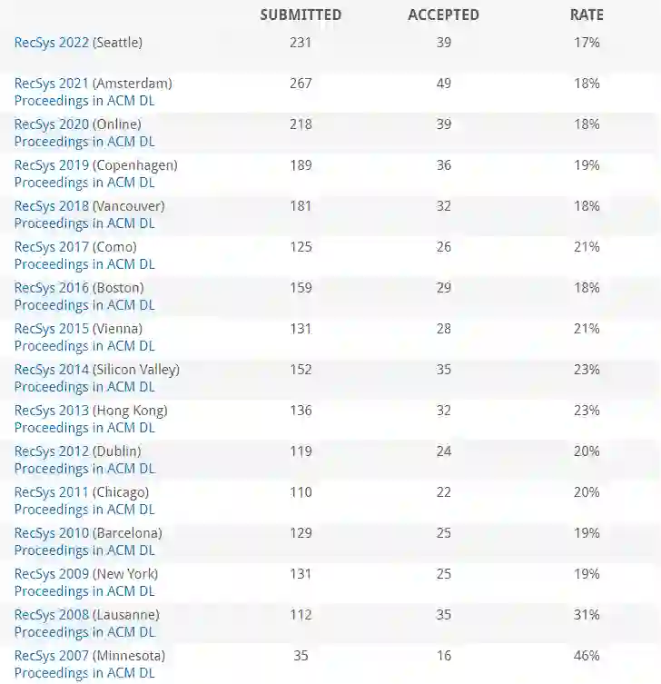 本年度的会议论文接收列表已于2022年6月29日在官方网站公布,其中包括38篇长文论文,15篇工业界演讲以及16篇海报)。值得一提的是,今年推荐系统年会共收到231篇有效投稿,最终录取了39篇推荐系统长文,录取率为17%,基本上与往年的录取率保持平衡。为了
