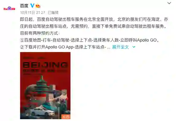 10月11日,百度官方微博发布消息,即日起,百度自动驾驶出租车服务在北京全面开放,用户可在海淀、亦庄的自动驾驶出租车站点,无需预约,直接下单免费试乘自动驾驶出租车服务。
