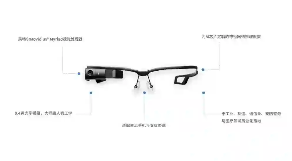 ▲亮亮视野人工智能AR眼镜—GLXSS ME,全球首款搭载 Intel® Movidius™ Myriad™ 2 视觉处理器的智能眼镜,产品具有强大的AI认知能力,自主研发的神经网络推理框架,为AI算法加速。适配安卓终端,双屏交互。定制深度学习引擎,提供人脸、物体多点高速检测—跟踪—识别。流媒体服务与深度学习引擎,搭建互惠开发生态。