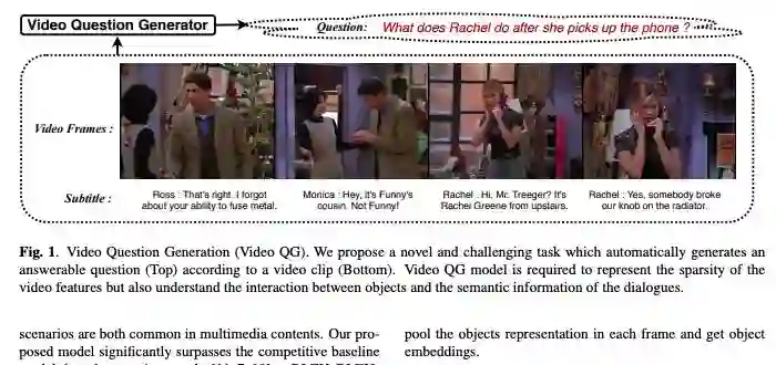 对视频问答任务而言,深度学习模型严重依赖海量数据,而这类数据的标注成本很高。这篇论文提出了一个新任务,可以自动根据视频片段中的视频帧序列和相应的字幕生成问题,从而减少了巨大的标注成本。学习如何对视频内容进行提问需要模型理解场景中丰富的语义以及视觉和语言之间的相互作用。为了解决这个问题,这篇论文提出了一种新的跨模式自注意力网络,以聚合视频帧和字幕的各种特征。通过实验证明了所提出的方法相对于基准方法可以有85%的提升。