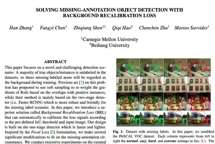这篇论文研究了一种新的且具有挑战性的目标检测场景:数据集中大多数真实对象或实例未被标注,因此这些未被标注的区域在训练过程中被视为背景。现有方法基于Faster RCNN,使用软采样与正实例的重叠来对RoI的梯度进行加权。这篇论文提出了一个新的名为背景重校准损失的解决方案,可以根据预定义的IoU阈值和输入图像来自动重新校准损失信号。这篇论文还进行了几项重大的修改,以适应缺失标注的情况。PASCAL VOC和MS COCO数据集上的实验表明这篇论文所提出的方法在很大程度上优于现有方法。