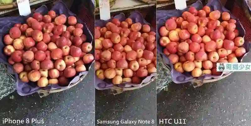 以三只手机拍公司附近的室外水果摊的苹果,明显看出 iPhone 8 Plus 在颜色处理上调整幅度最小,这次 U11 的鲜艳程度则最高,Note 8 其次。