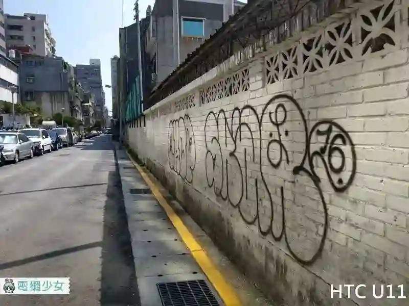 最近几天都是艳阳大蓝天,iPhone 8 Plus 的白天街景照,在三组照片中属于调整幅度最小的,而 Note 8 在色泽处理上对比度最高,U11 在色泽调整幅度属中间