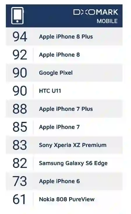 截至 2017/9/26 的 DxO mark 手机组拍照分数表