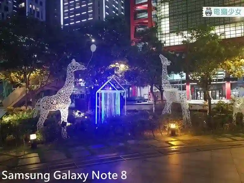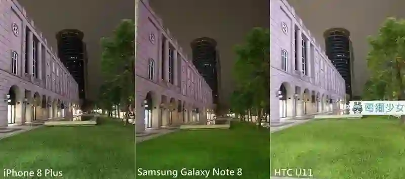一般只有一种颜色的光线下,三只手机拍出来的夜景则是 iPhone 8 Plus 感觉上没有做出什么更动,但店铺的光线过曝,Note 8 对于草地的调整则变得超级翠绿,U11 把整张照片的亮度直接拉高了,变得有点像是有打光的感觉。