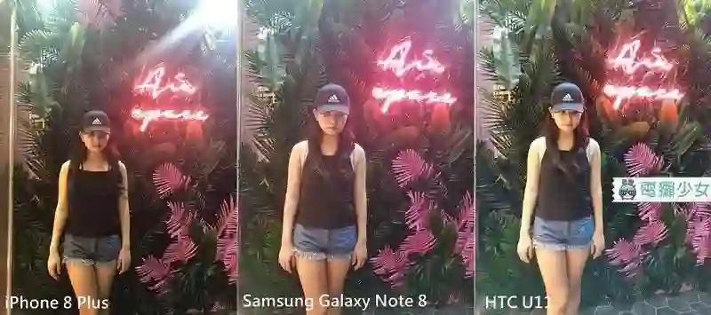 iPhone 8 Plus 人物偏黄,另外还是会有光晕很大的问题……虽然我觉得比前一代好很多了啦 Note 8 人物拍起来偏白,但看起来有一种光浮在照片上的感觉,而 U11 对比度在这一张照片上被拉高了,整体看起来很美,但肩膀就过曝了…