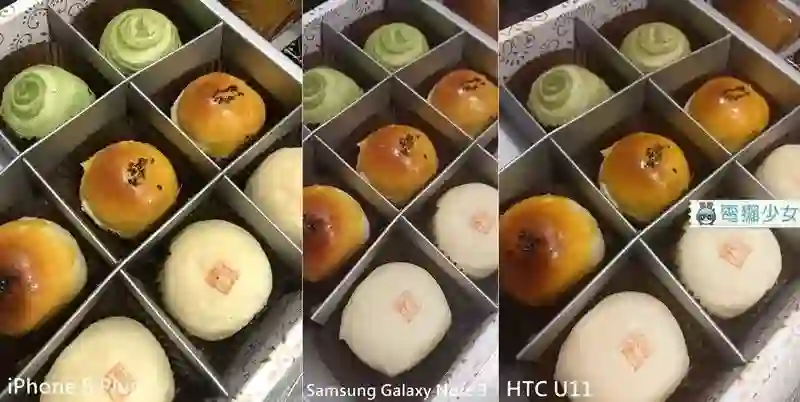 中秋节收到的月饼,在同样的室内日光灯下比较,iPhone 8 Plus 食物拍起来颜色鲜艳,看起来好吃,但是比起其他两只手机,也有比较偏黄的感觉,Note 8 则在会把稍微远一点的月饼稍微做景深处理,而且拍出来照片比较窄长,U11 整体色调则偏暗一些。