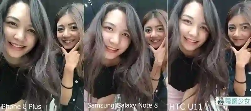 竹竹正好在测试一批美妆产品,很坏心的把她拉来合照><(被竹砍),iPhone 8 Plus 一如既往地保持,「修图?门都没有!」感觉超赤裸还帮我的额头过曝,Note 8 则是维持了「帮你变白!」的路线,U11 虽然稳定发挥,不过也是稍有过曝。