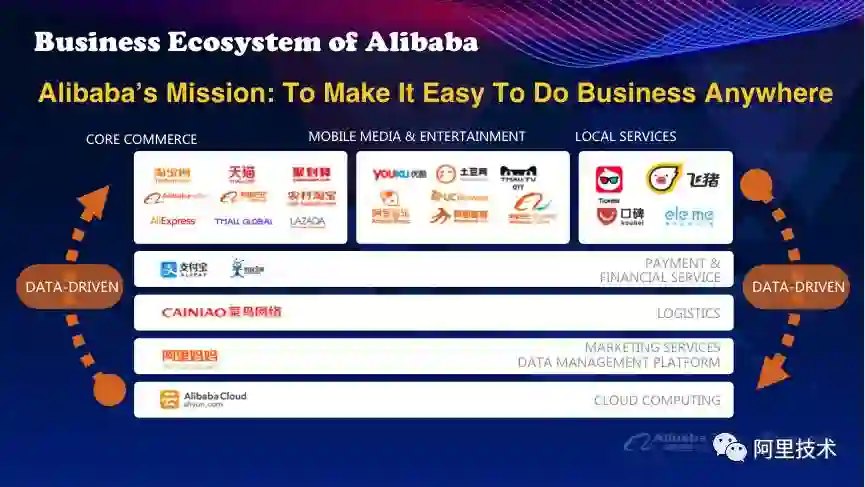 这是阿里的一个生态体系图。最底层是阿里云,这是我们的一个计算存储框架。上面是阿里妈妈,阿里妈妈是负责整个阿里巴巴计算广告的一个部门,再上面是菜鸟、支付宝和蚂蚁金服。然后是与电商业务相关的,像淘宝网、天猫、聚划算等等,或者是跟文娱相关的,优酷土豆,还有像阿里旅行,口碑之类的业态。