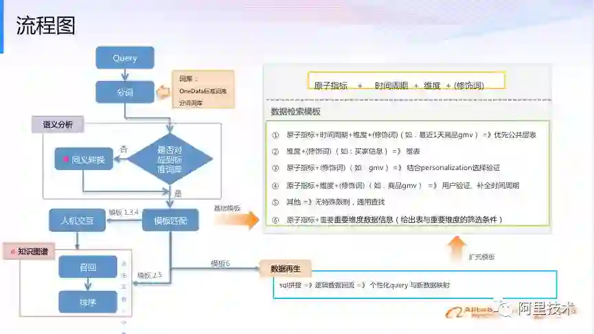 但是,我们这个场合下一定要反馈唯一的、准确的表。所以,接下来我们会有一些模板匹配,所以这里非常重要的一部分是人机交互这一块,把人机交互的结果,就是人要告诉你说,这个结果是否是他想到的,然后知识图谱整个刚才的框架有效的结合在一起,然后产生出你真正想找到那张表,然后整个的这个过程,其实这些是一些抽象出来的模板,这些模板可能是不够的。因为随着人的查询越来越多,模板也需要慢慢的扩展。现在我们还是基于一些规则判断一些模板,未来我们也会尝试,让这个机器自动产生一些模板。