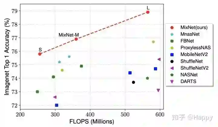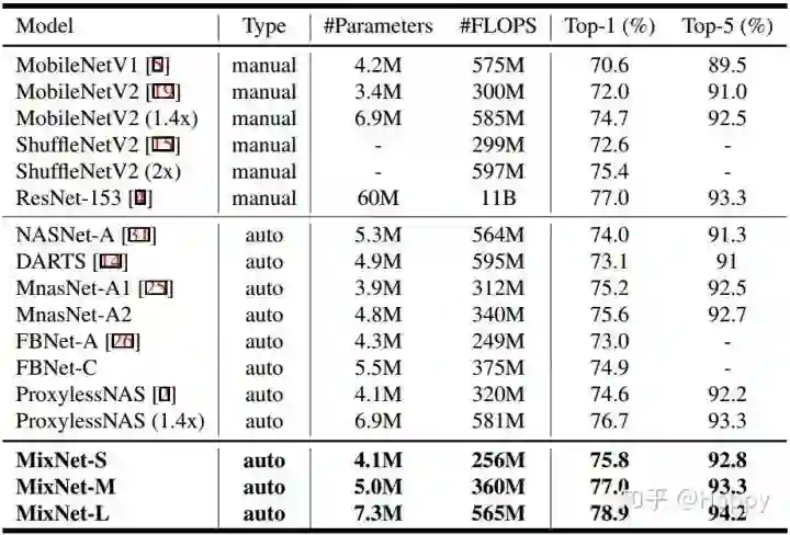 本文是谷歌大牛Quoc V. Le的在AutoML领域的又一力作。 下图给出了它同其他NAS所搜索网络在性能、FLOPs方面的对比,从中可以看出:MixNet取得完胜 。