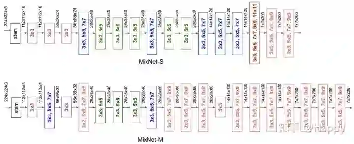 MixNet-S, MixNet-M两个网络的架构图如下所示。更多关于MixNet的信息请参考原文,这里不再详述。