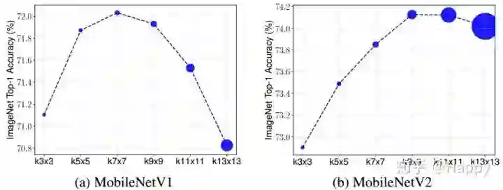 作者对该问题进行了研究与分析:更大的核可以取得更高的精度?作者基于MobileNetV1与MobileNetV2进行卷积核尺寸对于性能的研究与分析。从下图可以看出:当卷积核达到$9\times9$时模型精度达到最大,继续扩大卷积核会导致精度的下降。