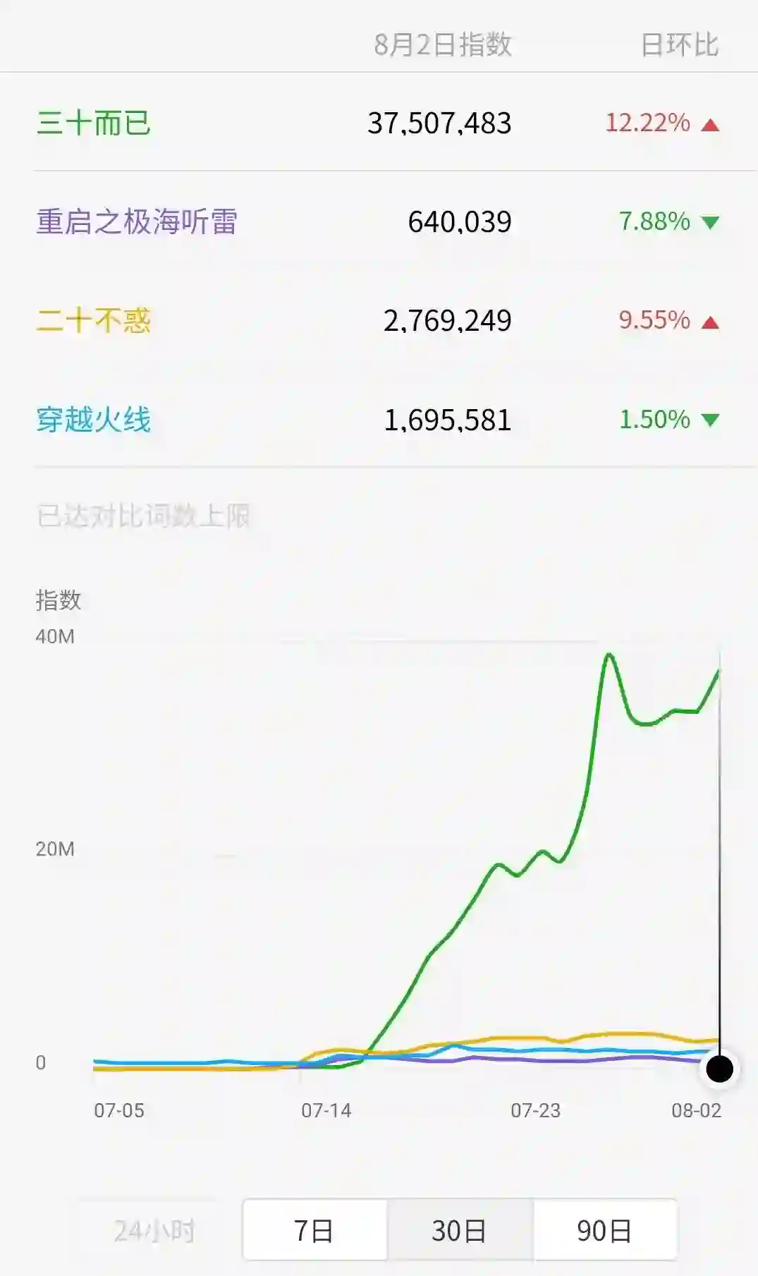 在各大数据网站上,《三十而已》也霸占了各种榜单。骨朵数据显示,8月3日,《三十而已》以82.19的全网热度位列连续剧市场第一;另外据猫眼专业版,其上线以来已连续16天登上电视剧单日热度榜首位。