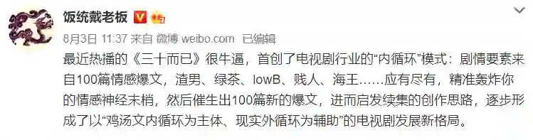 3日早上,财经博主饭统戴老板针对《三十而已》发布了一则短评,有网友在微博下评论称其为“方便上热搜的剧”。