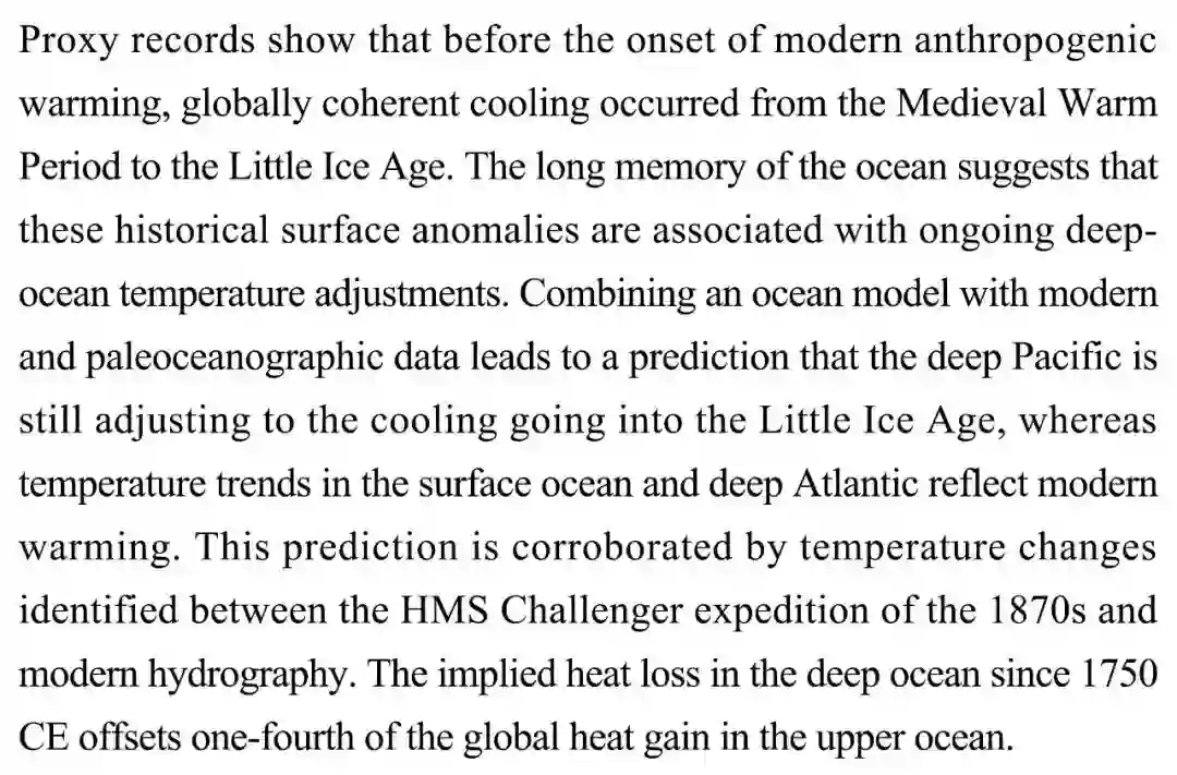 (导读 Westin)在现代人为活动导致变暖之前,地球均处于自中世纪暖期到小冰期的冷却状态中。这些历史上的海表异常可能与正在进行的深海温度调整有关。我们推断太平洋深层仍处于进入小冰期的冷却过程,而海洋表层和大西洋深层的温度变化趋势反映了现代变暖现象。自1750年以来的深海热损失抵消了全球变热对上层海洋温度增量的四分之一。
