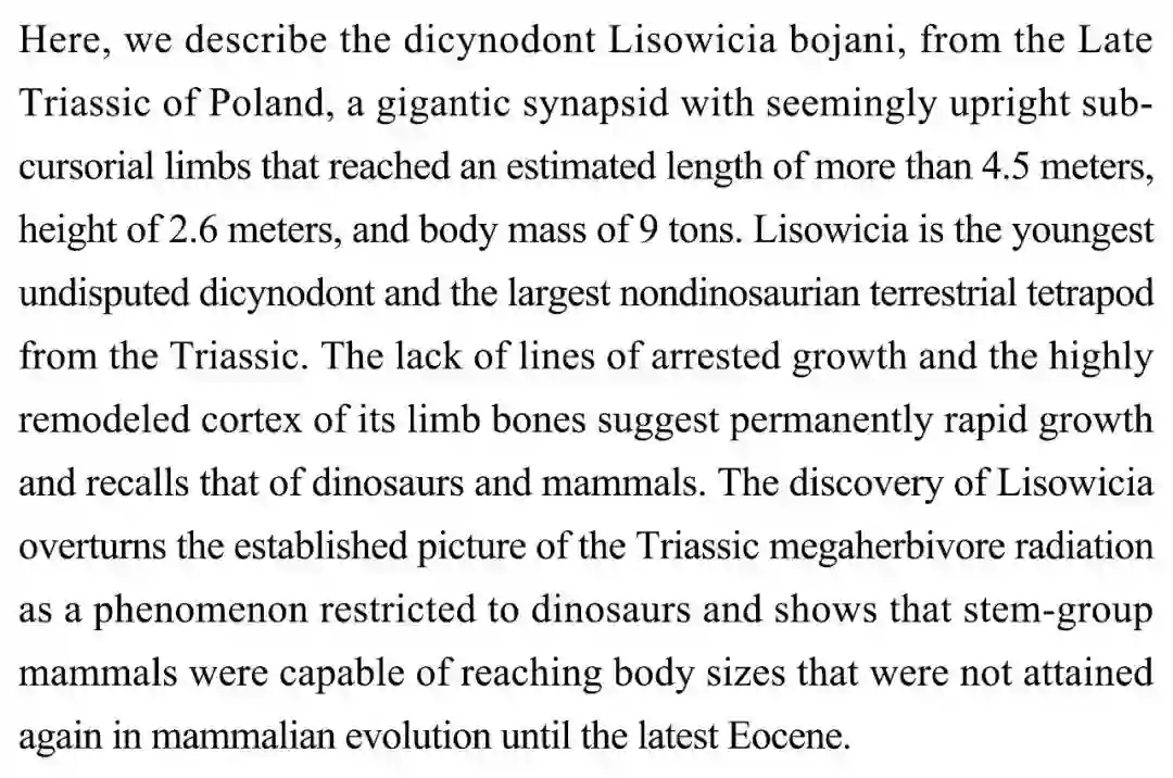 (导读 Westin) 波兰晚三叠世的伯氏利索维斯兽(Lisowicia bojani)是最年轻的二齿兽化石记录,也是体型最大的三叠纪非恐龙陆生四足动物。利索维斯兽可能发育适于奔跑的直立四肢。生长停滞线缺失和皮质骨的高度重塑表明其终生快速生长。与恐龙一样,干群哺乳动物在三叠纪演化出了巨大的体型,直到始新世末期哺乳动物才再次达到这种体型。