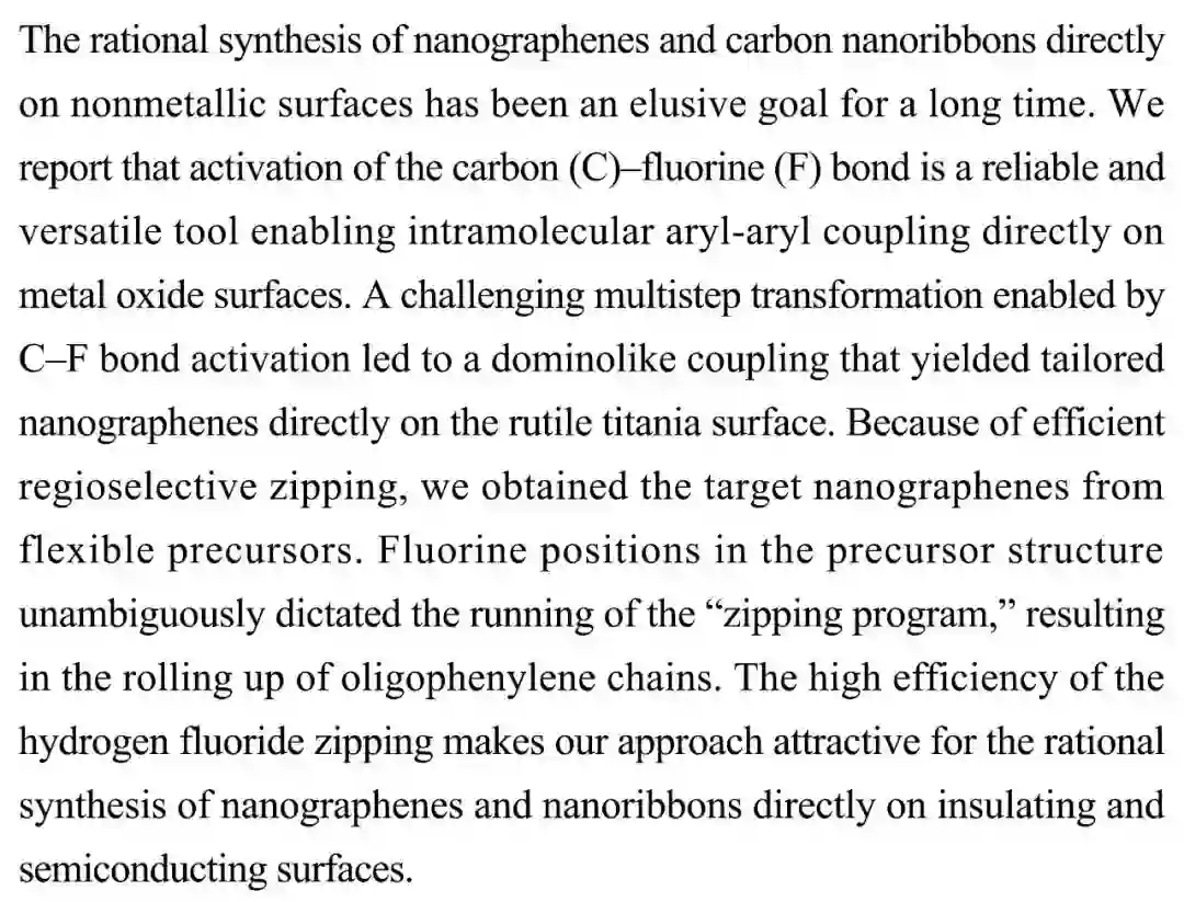 (导读:向菲菲)直接在非金属表面上合成纳米石墨烯和碳纳米条带一直是较难实现的目标。研究人员发现活化碳-氟键是一种可靠的工具,能在金属氧化物表面上实现分子内芳基-芳基偶联。激发碳-氟键诱导的多步反应转化能引起多米诺似的偶联反应,可在金红石TiO2表面上剪裁纳米石墨烯。这种高效的氢氟“拉链反应”,使得直接在绝缘和半导体表面上程序合成纳米石墨烯和纳米条带成为可能。