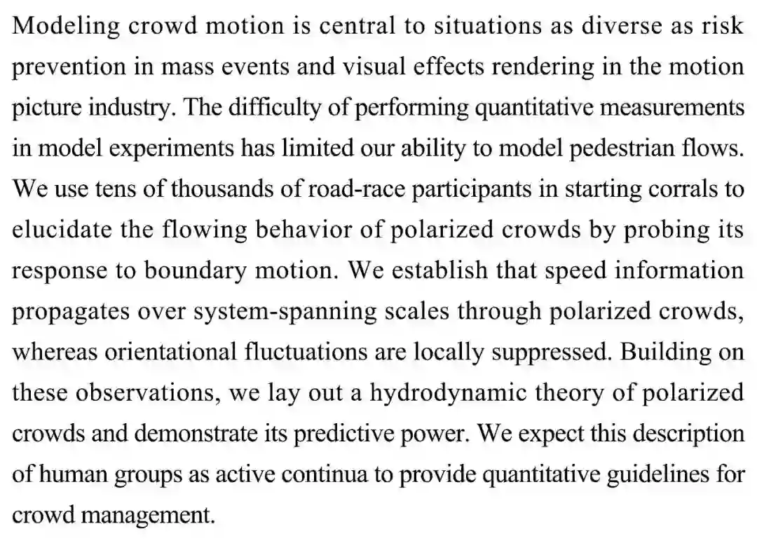 (导读 胡琦琳)本研究利用成千上万的公路参与者,并将他们围起来,通过探究其边界运动的动态响应阐明极化人群的流动行为。基于观察,研究人员提出了极化人群的流体力学理论,并证明了这项理论的预测能力。研究人员希望可以将这样的人类群体描述作为连续统,为人群管理提供定量的指导。
