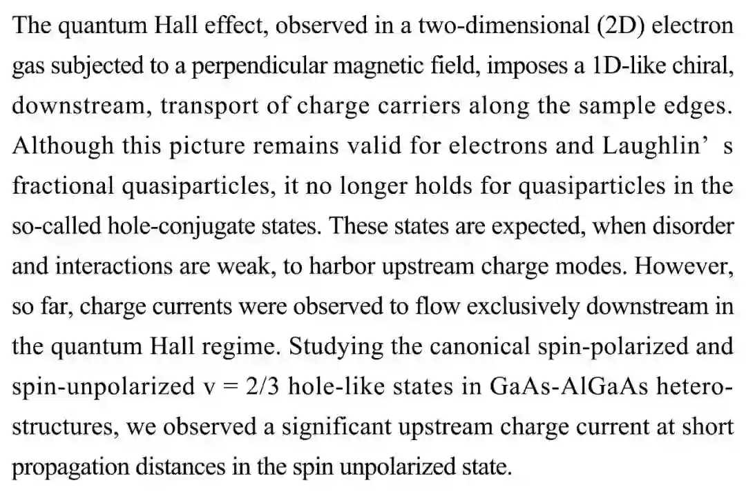 (导读 阿金)在垂直磁场中二维电子气观察到的量子霍尔效应会沿着样品边缘产生电荷载流子的一维状手性下行输运。本研究分析了GaAs-AlGaAs异质结构中的正则自旋极化和自旋非极化V = 2/3类-空穴态,在自旋非极化态的短程传播距离中观察到明显的上行电流。