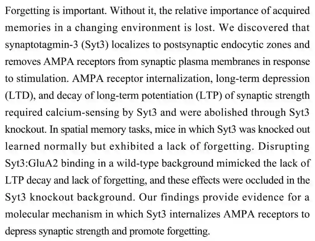 (导读 郭怿暄)遗忘是非常重要的。本研究发现突触结合蛋白-3(Syt3)位于突触后的内吞作用区域,并在刺激后从突触细胞膜上移除AMPA受体。而AMPA受体内化,突触强度出现长期抑制(LTD),长期增强作用(LTP)发生衰减都依赖钙敏Syt3。敲除Syt3导致小鼠可以正常学习,但不会遗忘。破坏Syt3:GluA2结合与缺乏LTP衰减和遗忘表型相似。该发现表明Syt3内化AMPA受体抑制突触强度,促进遗忘。