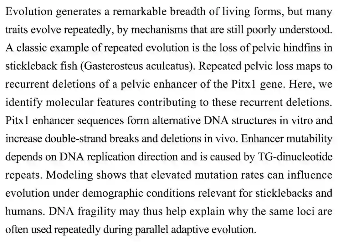 (导读 阿金)演化产生生命形式多样性,但很多特征会重复演化,其中一例就是棘鱼骨盆后鳍的缺失。本研究确认骨盆缺失所映射的Pitx1基因反复删除的分子机制,Pitx1增强子序列形成体外替代性DNA结构,增加体外的双链断裂和删除。增加的突变率能够影响同棘鱼和人类相关的统计学条件下的演化过程。