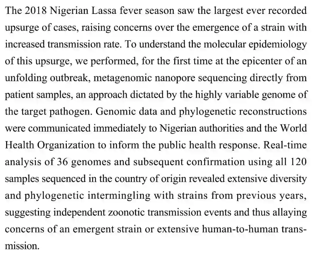 (导读 阿金)2018年尼日利亚拉沙热疫情爆发,出现有史以来最多病例激增。本研究为了解爆发背后的分子流行病学,在疾病爆发中心直接获得病人样本进行宏基因组纳米孔测序,并将获得信息及时与政府和WHO沟通指导公共卫生措施。对36个基因组进行实时分析并利用120例样品确认后,发现具有前几年病毒株的广泛多样性以及株间发生系统发生混合,表明并未出现全新病毒株或广泛人与人间传播。