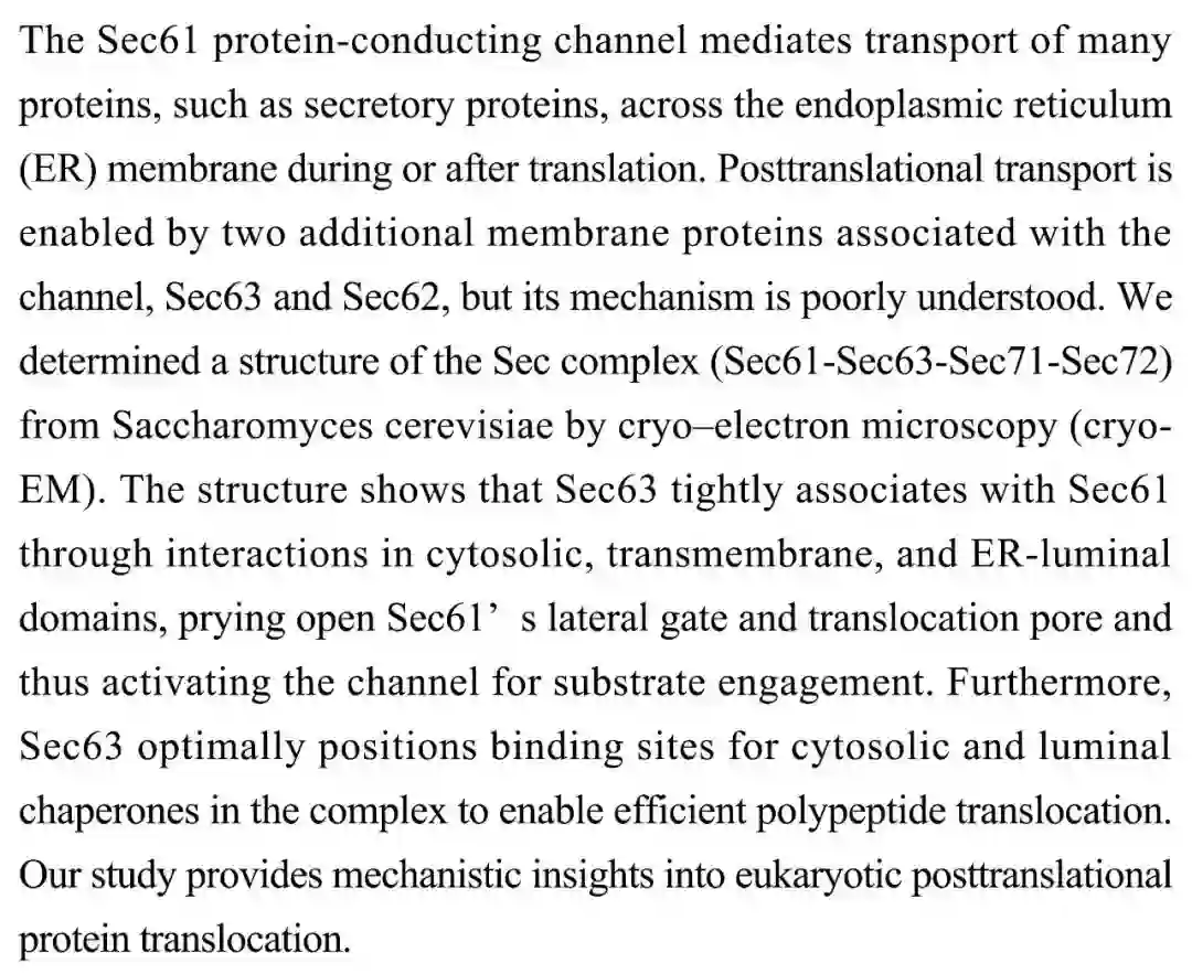 解析酵母翻译后Sec蛋白 - 易位通道复合体的结构