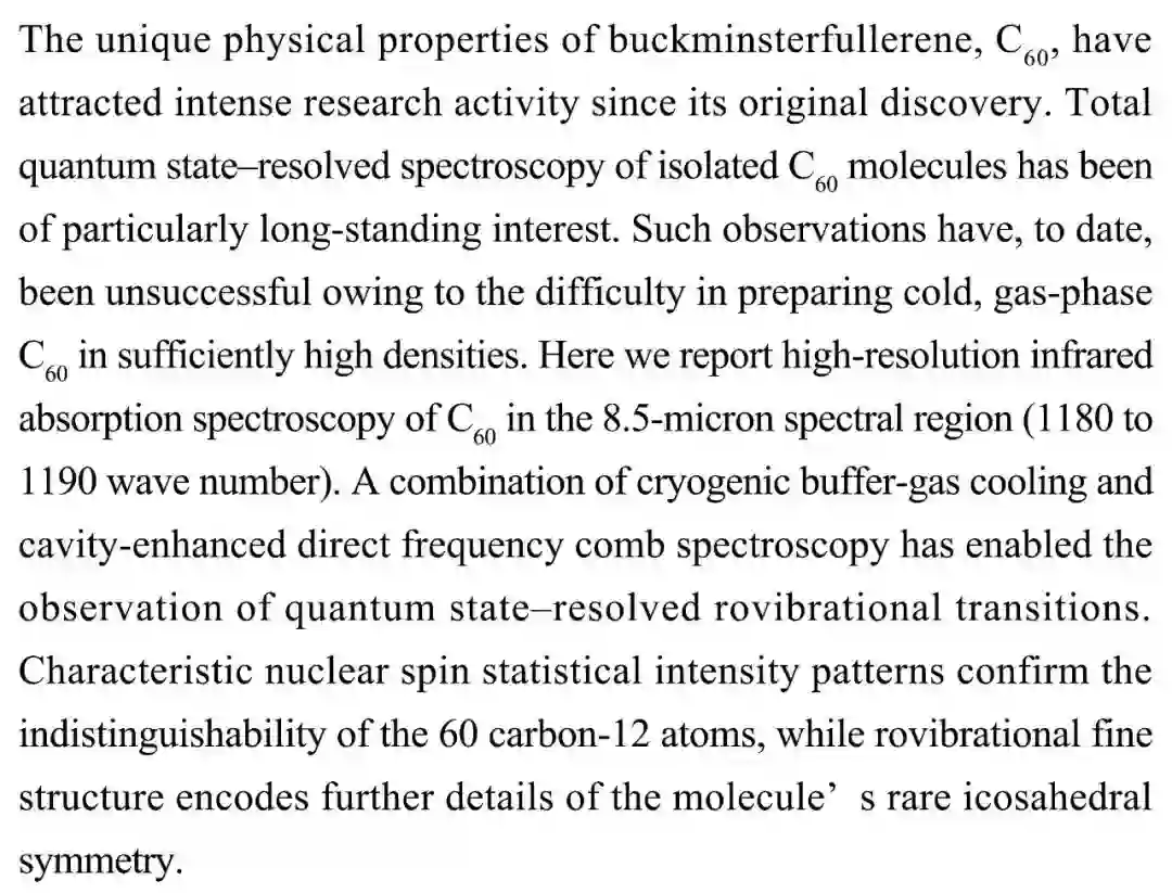 (导读 阿金)富勒烯C60分子的全量子态分辨光谱一直备受关注,但目前由于制备高密度冷气相C60的难度较高,尚无实验观测。本研究报道了在8.5微米光谱区域的C60高分辨率红外吸收光谱,观察到量子态可分辨的振转跃迁。其核自旋统计强度的特征模式确认60个碳12原子的不可分辨性。