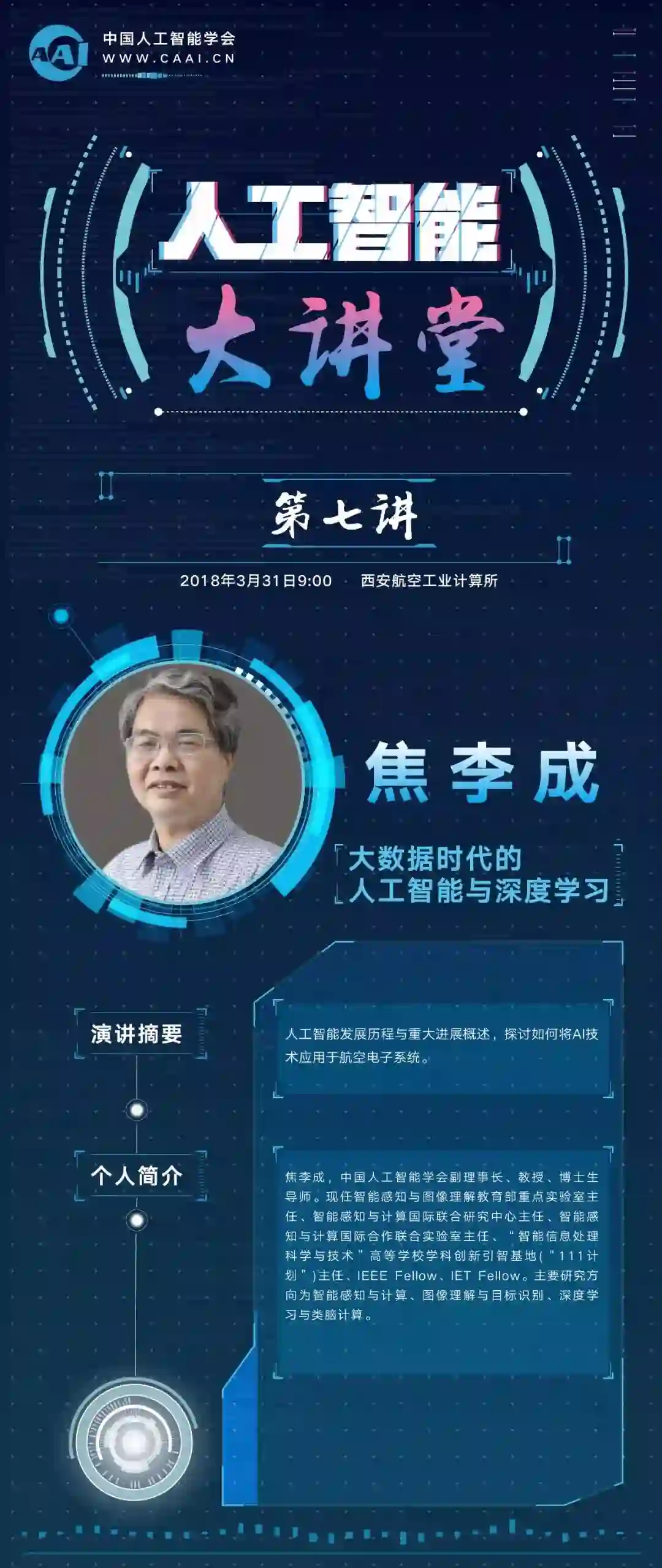 2018年3月31日,中国人工智能学会副理事长焦李成教授将在西安航空工业计算所为大家带来精彩的第七讲《大数据时代的人工智能与深度学习》。