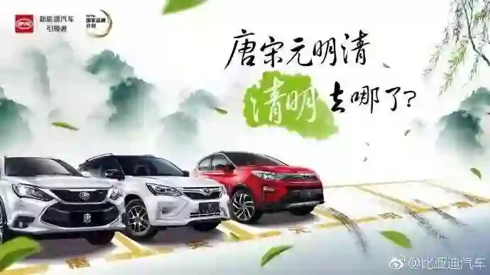分析:采用拆词+释义的方式,将“清明”的“清”字解释为“清朝”,“明”字解释为“明朝”,与《鹿鼎记》里面的“反清复明”改成“清明重阳”算是异曲同工。释义与品牌特性(比亚迪唐宋元明的朝代系列)结合起来,颜色上选用青绿色,更突显主题元素(颜色),简单明了。