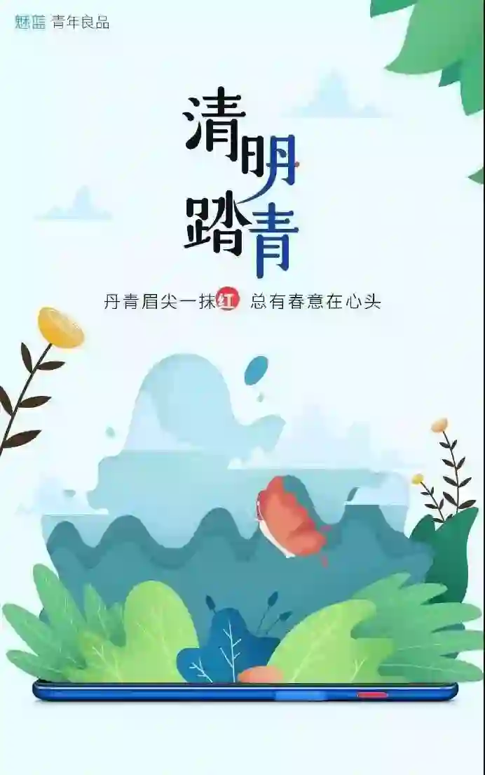 分析:采用拆词的方式,将“清明”的“明”字拆为“月”,然后通过设计将“月”字模拟成“丹”字,与踏青的“青”字组成“丹青”二字。与品牌特性(丹青是魅蓝手机一个系列产品)结合起来,颜色上选用青绿色,更突显主题元素(颜色)。
