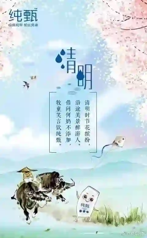 分析:采用化用+原创的方式,将杜牧《清明》一诗第一句化用为“清明时节花缤纷”,后面三句原创了与品牌特性相关的内容,同时画面上还有放风筝,突显主题元素。