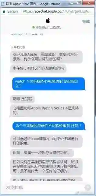 而今天网上曝光了一组用户和苹果客服对话的截图,从截图中可以看到,苹果客服人员证实了AppleWatch Series 4确实具备了心电图功能,而国行版本仅仅是因为在中国大陆地区没有得到医疗机构的认可,但是客服表示:如果想了解自己的心电图,不作为监测报告,是完全可以满足的!也就是说,国行版Apple Watch Series 4也有心电图功能,只是不能作为监测报告等医疗根据。