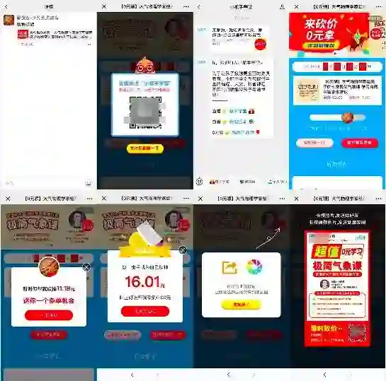 1. 裂变吸引:以便宜、利他和契合人群痛点的文案吸引用户点击,比如图中的文案“0元免费拿”、“大气物理学家”、“7节课”等都是为了引起好奇。
