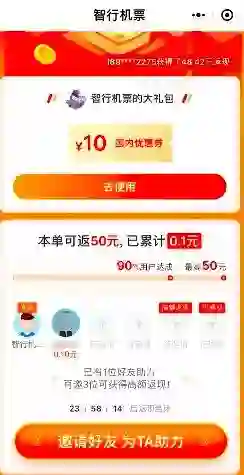 6. 助力返现:又是由抢票软件发起的新玩法,逻辑很简单,邀请几位好友,每位好友助力获得到不同程度的返现,具体来说是优惠券,有目标优惠券额度,满足人数即可,与砍价几乎别无二致。