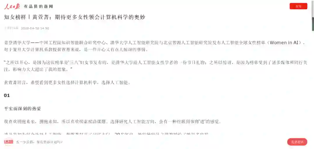 2020 年 4 月 18 日,人民日报以《知女榜样〡黄萱菁:期待更多女性领会计算机科学的奥妙》为题,报道人工智能全球女性榜单入选者、复旦大学计算机系教授黄萱菁。