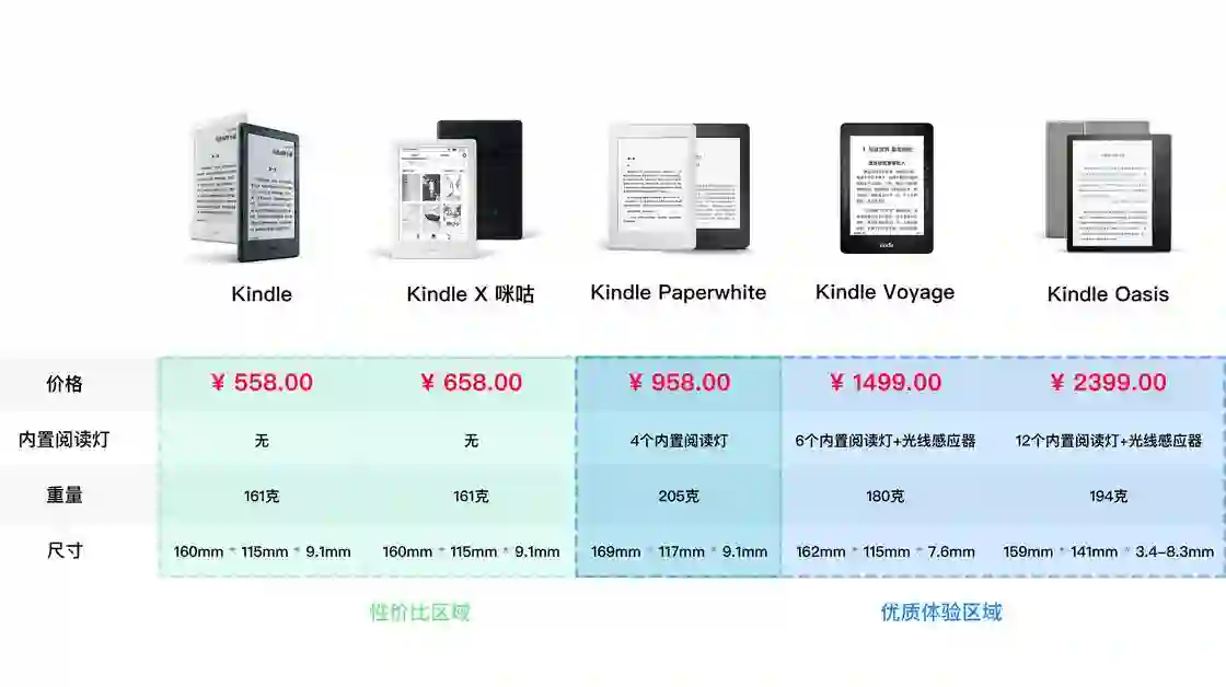亚马逊近年来几乎每年都会发布 Kindle 新品,以下是目前在售的几款,基本切中了所有的用户群。根据下图所示,价格呈梯度上升,不同款 Kindle 的体验和场景均有不同程度的提升,以经典款 Kindle PaperWhite 为分界,可以分为性价比区域和优质体验区域。