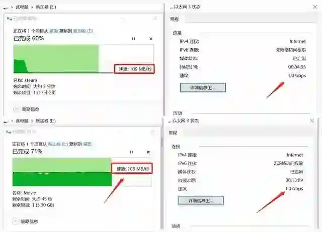 在千兆下通过文件拷贝测试读写速度与之前测试保持一致,读写都可以稳定在110MB/s。