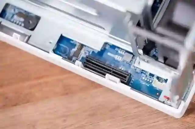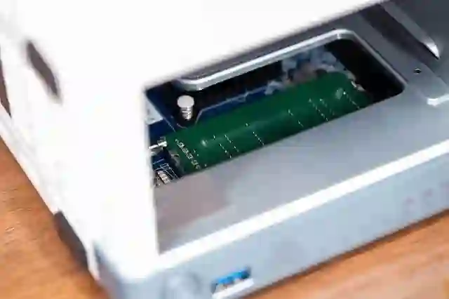 PCIe 卡槽特写,目前来讲支持 PCIe 扩展的 NAS 产品并不多,双盘位的支持这个的应该之前也只有 QNAP 支持,像是群晖的也只有高端的少数支持,像是 9 系的经典 918+ 都不支持。