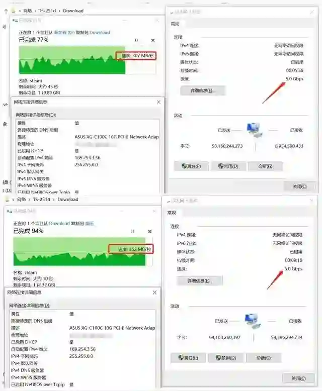 另外 QNAP 的 nas 在多网口模式下是支持虚拟交换机模式的,如果你没有万兆交换机,也可以选择虚拟交换机的方式之间通过 QNA-UC5G1T 的 5G 网卡直连 PC 的,可以看到 5G 的带宽已经被正常识别了。